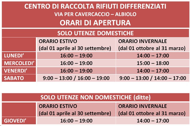 Di seguito si riportano gli orari di apertura del Centro di Raccolta: